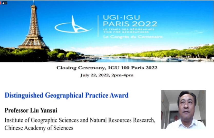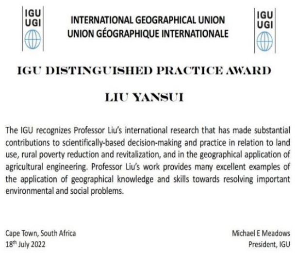 On July 18th, 2022, Prof. Yansui Liu was awarded the IGU Distinguished Geographical Practice Award for 2022. He was selected for his outstanding contributions to scientific decision-making and practice in the field of land use, rural poverty reduction and rural revitalization, and the application of agricultural geoengineering.