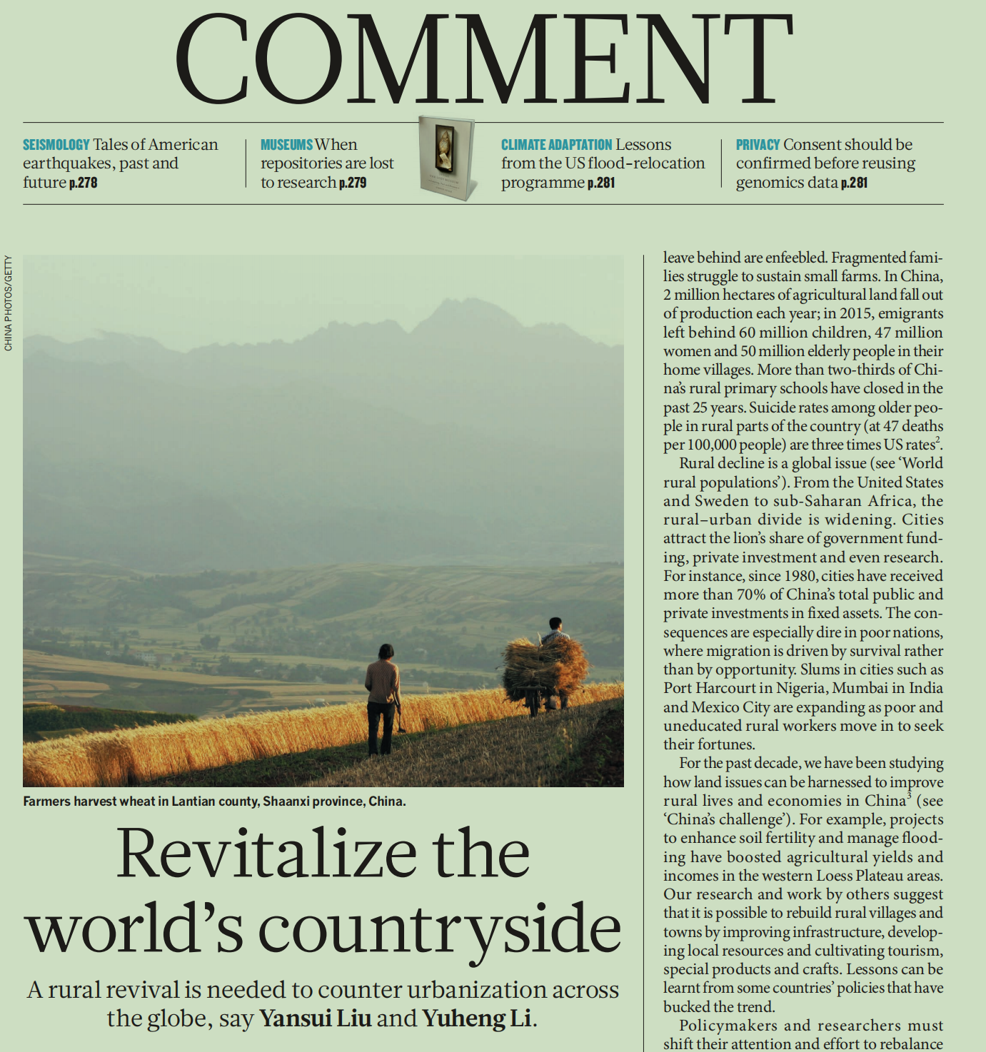 The latest issue of Nature argues that a rural revival is needed globally to counter urbanization. The paper is co-authored by Professor Yansui Liu and Associate Professor Yuheng Li of the Institute of Geographic Sciences and Natural Resources Research (IGSNRR), Chinese Academy of Sciences. Professors Liu and Li are respectively chair and secretary of the recently established IGU Commission on Agricultural Geography and Land Engineering (AGLE). They argue that,while urbanization gets a lot of attention globally as cities grow, most particularly in Asia and Africa, the rural decline that has accompanied this seems to have gone largely unnoticed.