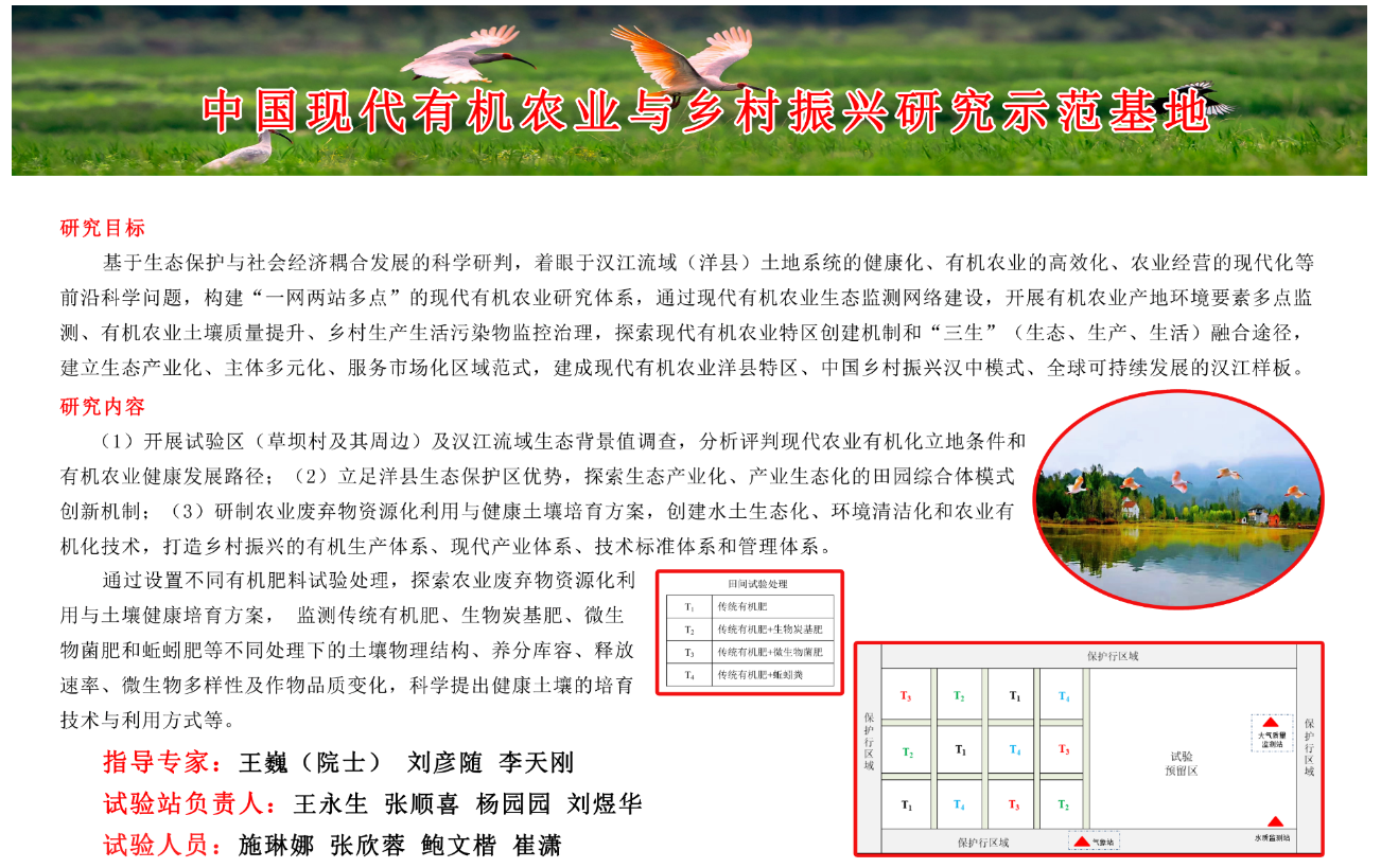 研究内容:(1)开展试验区(草坝村及其周边)及汉江流域生态背景值调查,分析评判现代农业有机化立地条件和有机农业健康发展路径;(2)立足洋县生态保护区优势,探索生态产业化、产业生态化的田园综合体系创新机制与模式;(3)研制土地整治、土壤改良、水土配置等关键技术,创建精准脱贫、乡村振兴、城乡融合规划技术及其集成示范体系。