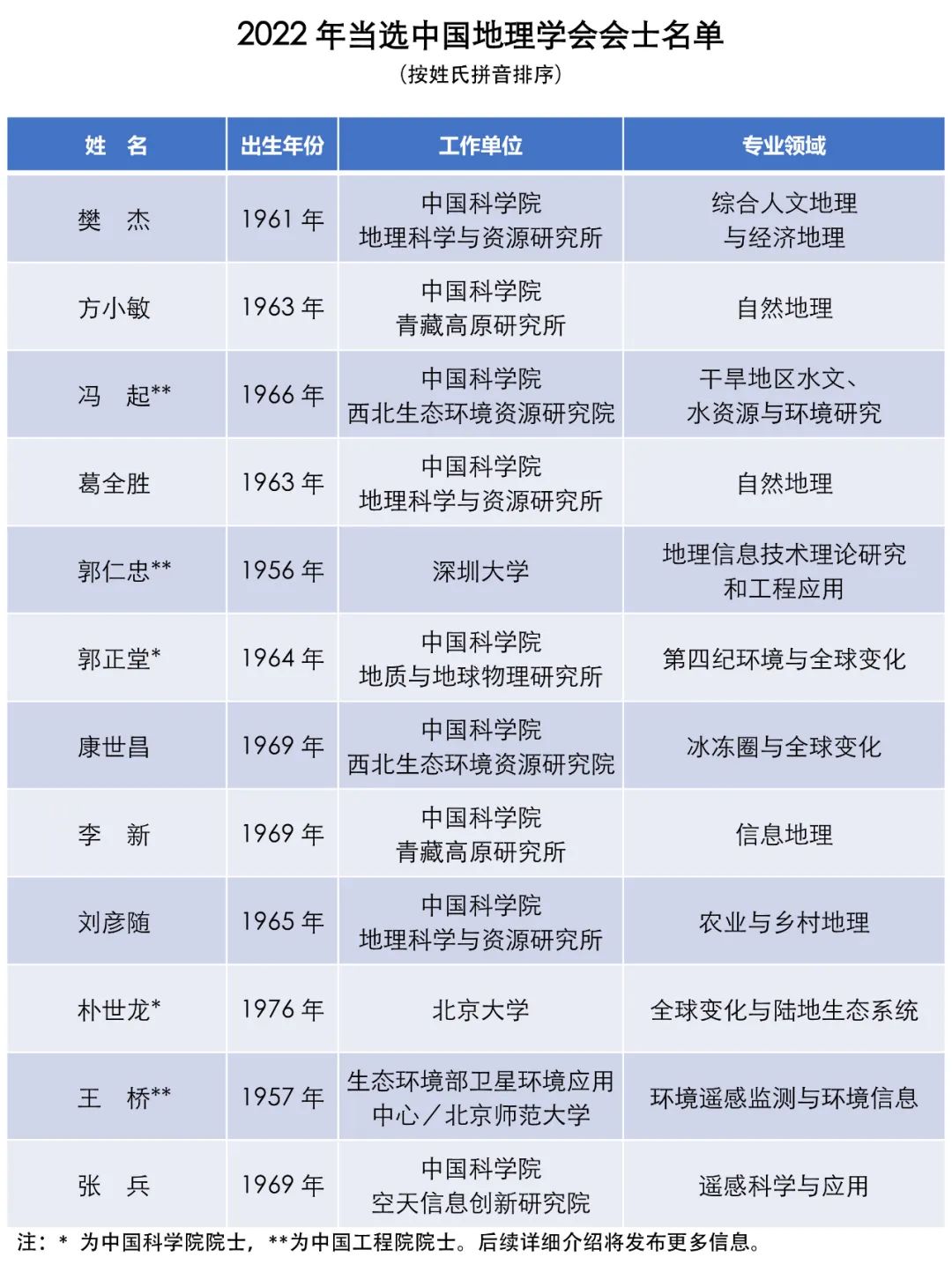 根据《中国地理学会会士章程》、《中国地理学会会士增选办法》和《2022年中国地理学会会士选举实施细则》,中国地理学会于2022年3月启动了2022年“中国地理学会会士”增选工作。经组织推荐、资格审查、通讯评审和会议终评等环节,产生会士建议人选。经中国地理学会十二届十一次常务理事会审议批准,确定樊杰、刘彦随等12人当选中国地理学会会士,Michael Batty等3人当选中国地理学会外籍会士,Ronald F. Abler等2人当选中国地理学会外籍 荣誉会士。
