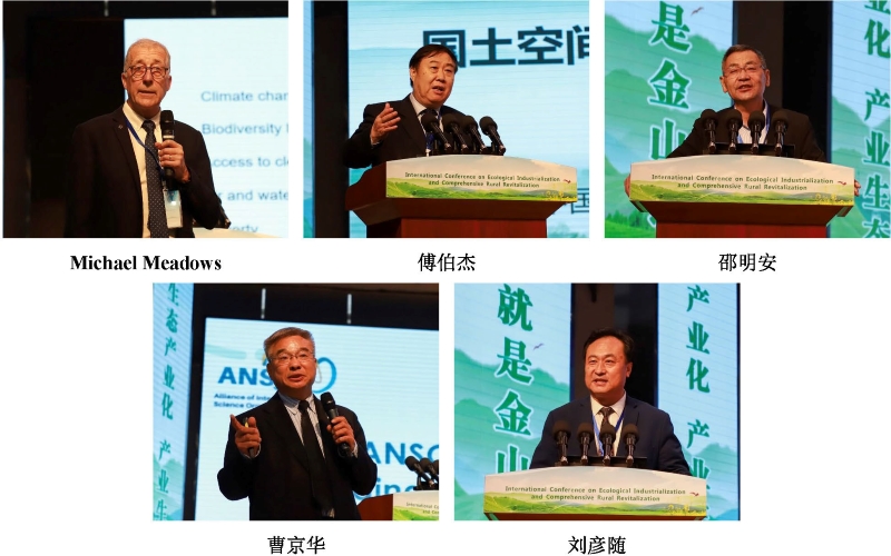 (2)论坛特邀报告。特邀报告由发展中国家科学院院士、IGU-AGLE主席刘彦随和广西大学长江学者特聘教授龙花楼主持。Michael Meadows院士作了《Rural Revitalization and the Sustainable Development Goals: Challenges, Progress and Prospects》的报告,系统讲述了乡村振兴与可持续发展面临的挑战、主要进展和前景展望。傅伯杰院士作了《国土空间生态修复与乡村振兴》的报告,系统解析了生态修复与乡村振兴的逻辑关系和耦合发展路径。邵明安院士以《建设数字乡村,助力乡村振兴》为题,讲述了数字乡村发展的现状、存在的问题与解决思路。“一带一路”国际科学组织联盟秘书处执行主任曹京华以《ANSO Efforts for Sustainable Development》为题,围绕可持续发展讲述了ANSO做出的贡献。发展中国家科学院院士、IGU-AGLE主席刘彦随以《全球可持续发展与人地系统科学》为题,系统介绍了全球可持续发展与人地系统科学新理论、新方法和新实践。特邀报告高屋建瓴、全面系统,深入阐明国内外生态产业化与乡村振兴的新理论、新案例,梳理提炼全面乡村振兴范式、生态产品价值转化路径与模式,为全球化背景下人与自然和谐共生、建设宜居宜业和美乡村提出了系统性新思路、新建议。