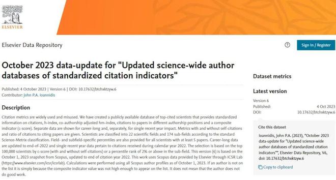 近日,美国斯坦福大学发布了2023年度“全球前2%顶尖科学家榜单”,榜单基于Scopusicon数据库,由斯坦福大学John P.A.Ioannidis教授团队与Elsevier旗下Mendeley Data发布。统计的论文涵盖SSCI、SCI、EI期刊、EI会议,使用了如下六种关键因素的指标来进行打分:1)总引用量;2)Hirsch H-index;3)共同作者修正的Schreiber Hm-index;4)单独作者;5)单独或者第一作者;6)单独、第一或者最后作者的文章引用量。