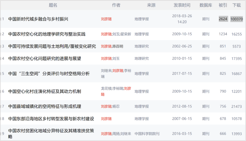 据中国知网(CNKI)(2024年4月20日),论文已下载100370次、被引用2624次,在CNKI“乡村振兴”主题下的论文下载、被引量排名“双第一”,也是《地理学报》创刊以来(1934年)论文下载量排名第一、被引量排名第三的论文。