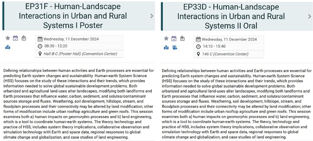 12月11日,团队成员在分会场“EP31F - Human-Landscape Interactions in Urban and Rural Systems I Poster”和“EP33D - Human-Landscape Interactions in Urban and Rural Systems II Oral” 分别作了海报交流和口头报告。