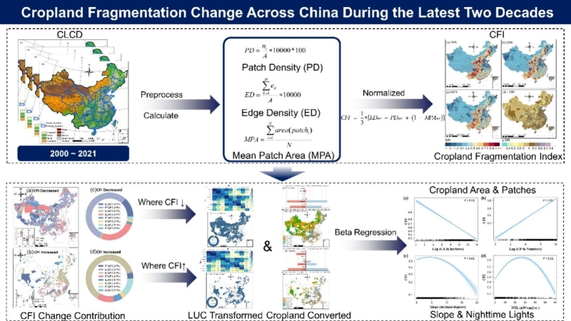 METHODS: Utilizing the 30 m annual and continuous time series Landsat-derived annual China land cover dataset (CLCD) from 2000 to 2021, we integrated three landscape pattern metrics- patch density (PD), mean patch area (MPA), and edge density (ED)- to devise a new comprehensive cropland fragmentation index (CFI). We also developed a Beta regression method to identify the relationships between CFI and key factors from human and natural perspectives.